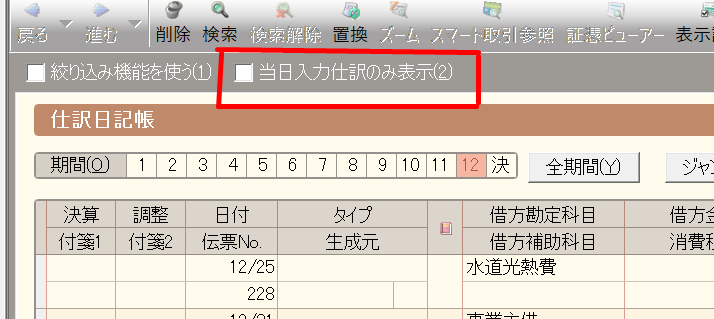 処理前のバックアップデータを復元させることも可能ですが、私は「当日入力の仕訳のみ表示」機能を使っています。