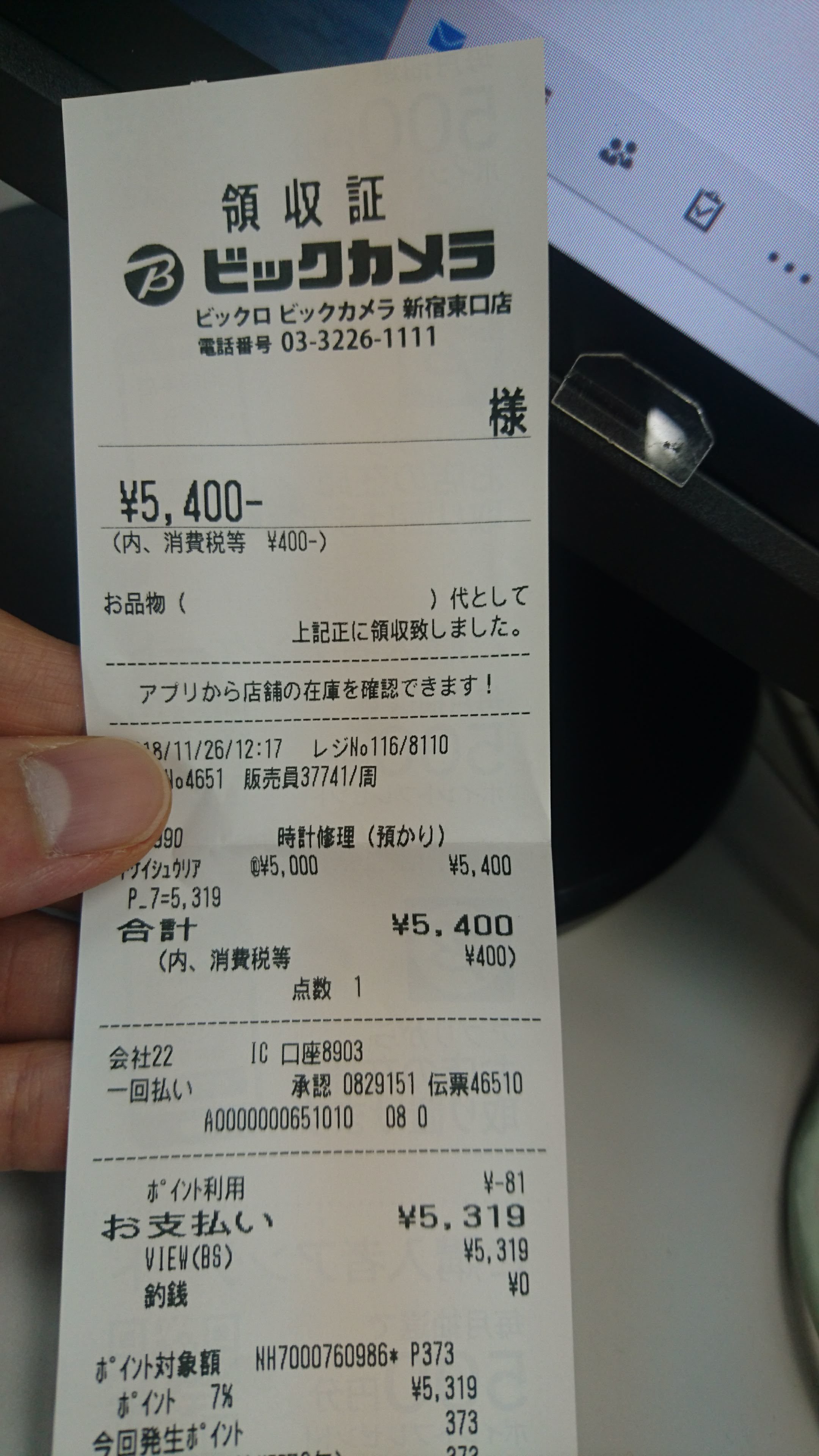 ※ビックカメラのレシートですが「腕時計の電池交換のため」経費にはしていません。