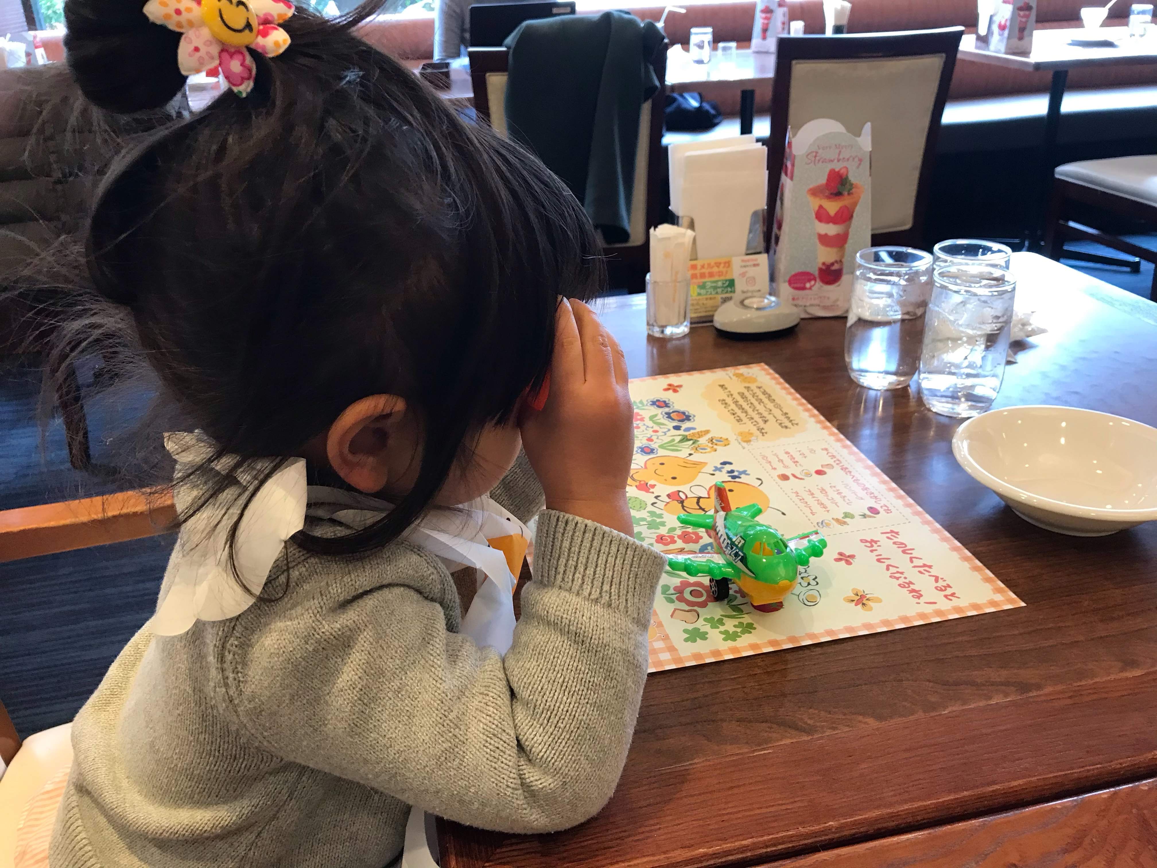 二人とも軽い鼻風邪のため、幼児向けの鍼灸へ行きました。その途中でロイヤルホストに行きオモチャをもらったみたいです。