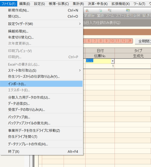 弥生会計の仕訳日記帳を開きながら「ファイル」の「インポート」です。
