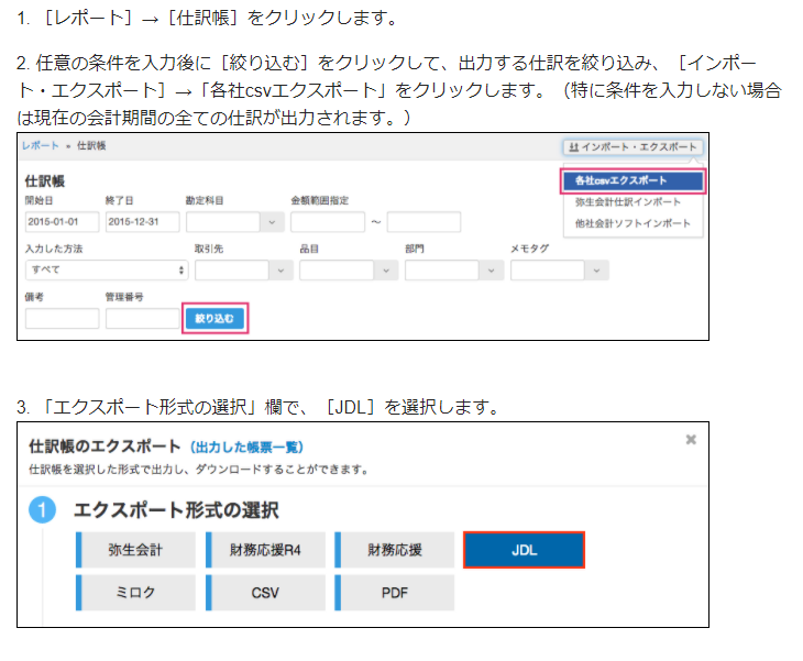 弥生会計からエクスポートしてJDLウェブポストボックスへ