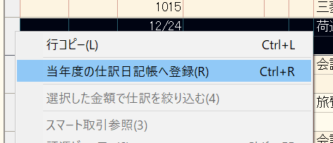 該当する仕訳を右クリックし「当年度の仕訳日記帳へ登録」で、今年度に仕訳がコピーされます。