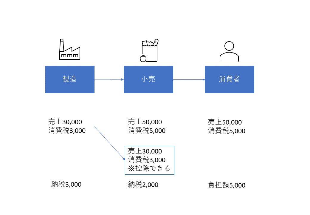 消費者からもらった5,000円を納税するのではなく、その前段階で支払った消費税3,000円を引くことができます。