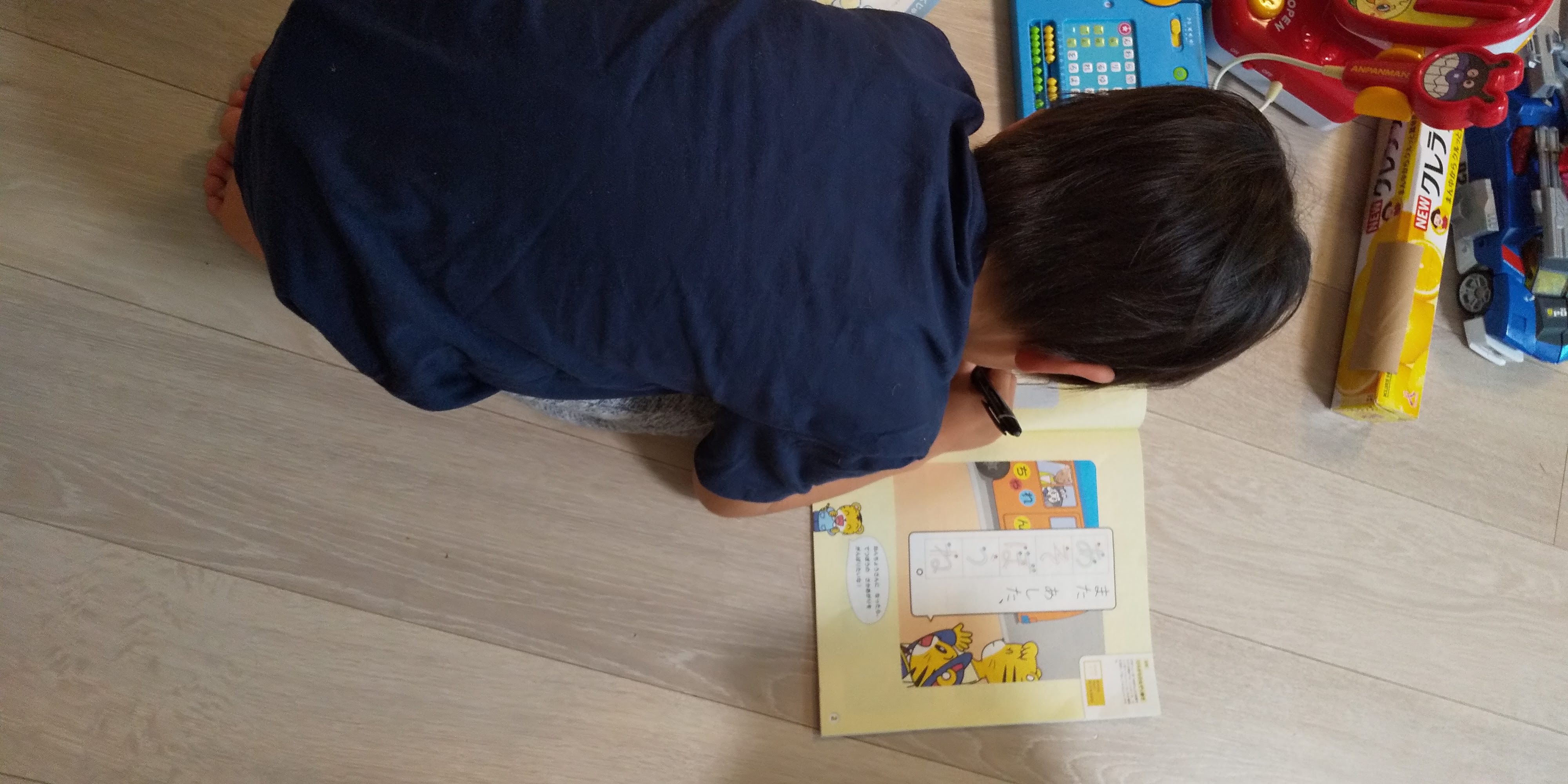 兄:しまじろうの子供チャレンジをしています。「前に来たやつ(先月号)やらないと、次来ないよ」と言われると集中して、ひらがなワークしていました。