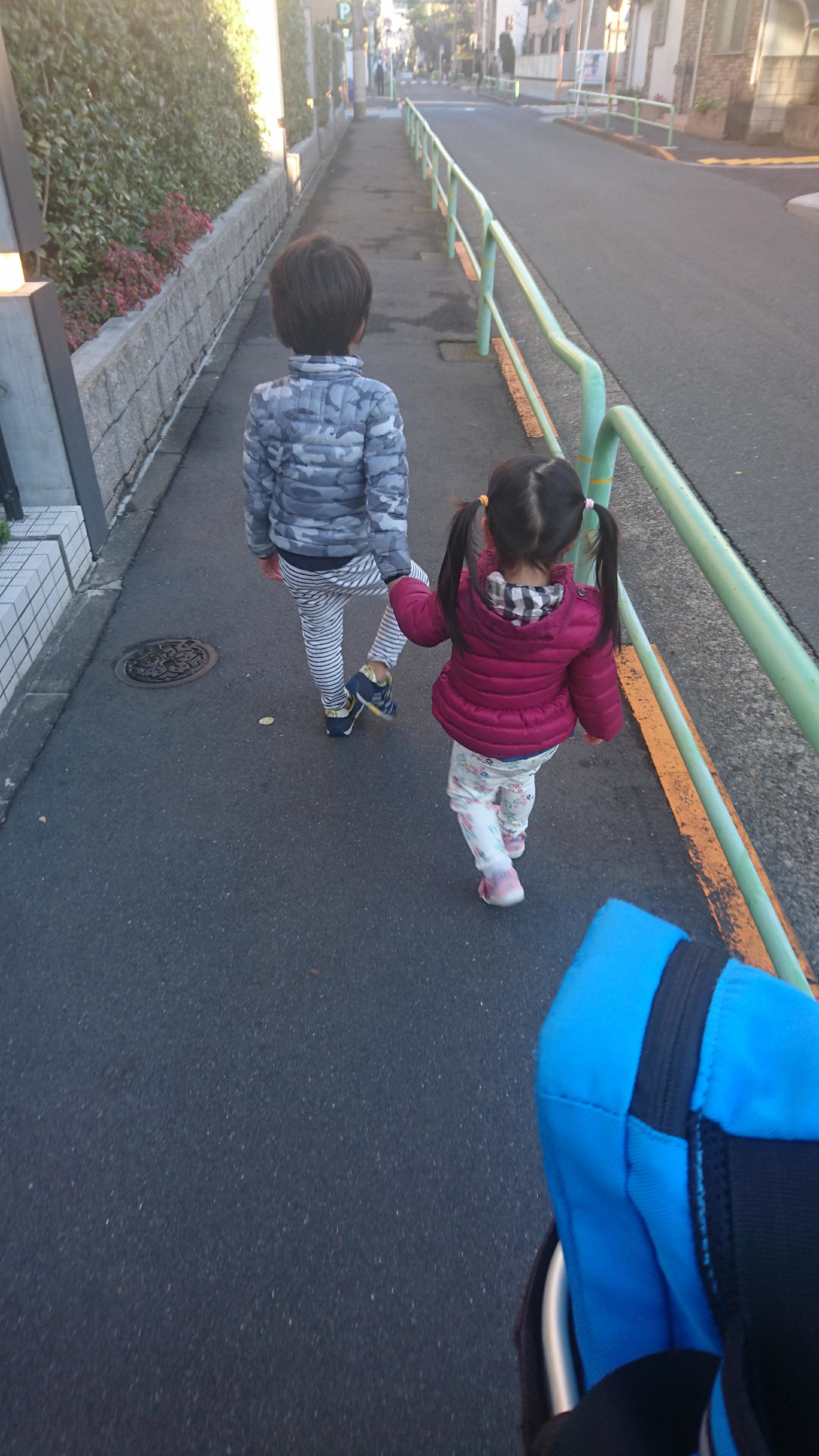 朝の登園時の写真です。「歩いていく」と言うので。途中から自転車に乗ってもらいました。
