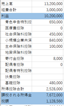 ※👆のexcelでは青色申告特別控除と所得控除を同じカテゴリーにしていますが、本来は青色申告特別控除と食控除は別モノです。