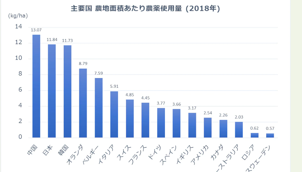 FAO(国連食慮農業機関)調べでは、農地1ha当たり11.8㎏の農薬を使っています(2018年)。中国や韓国とほぼ近い、世界トップクラスの農薬使用量を誇ります。