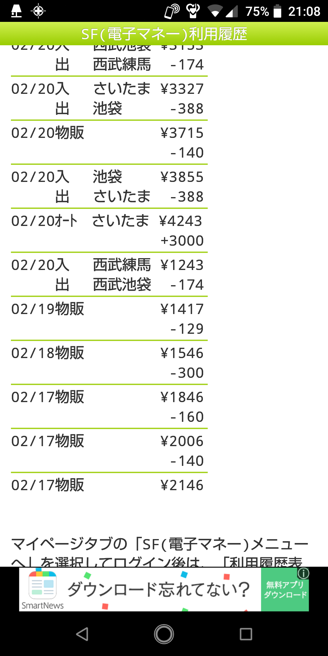 電車の改札でオートチャージする設定にしているので、モノを購入したときには残高不足になるかもしれませんが。