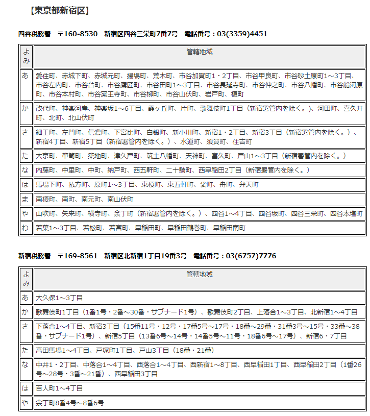たとえば、東京都新宿区であれば新宿税務署で良さそうですが、住所によっては四谷税務署が管轄になることも。