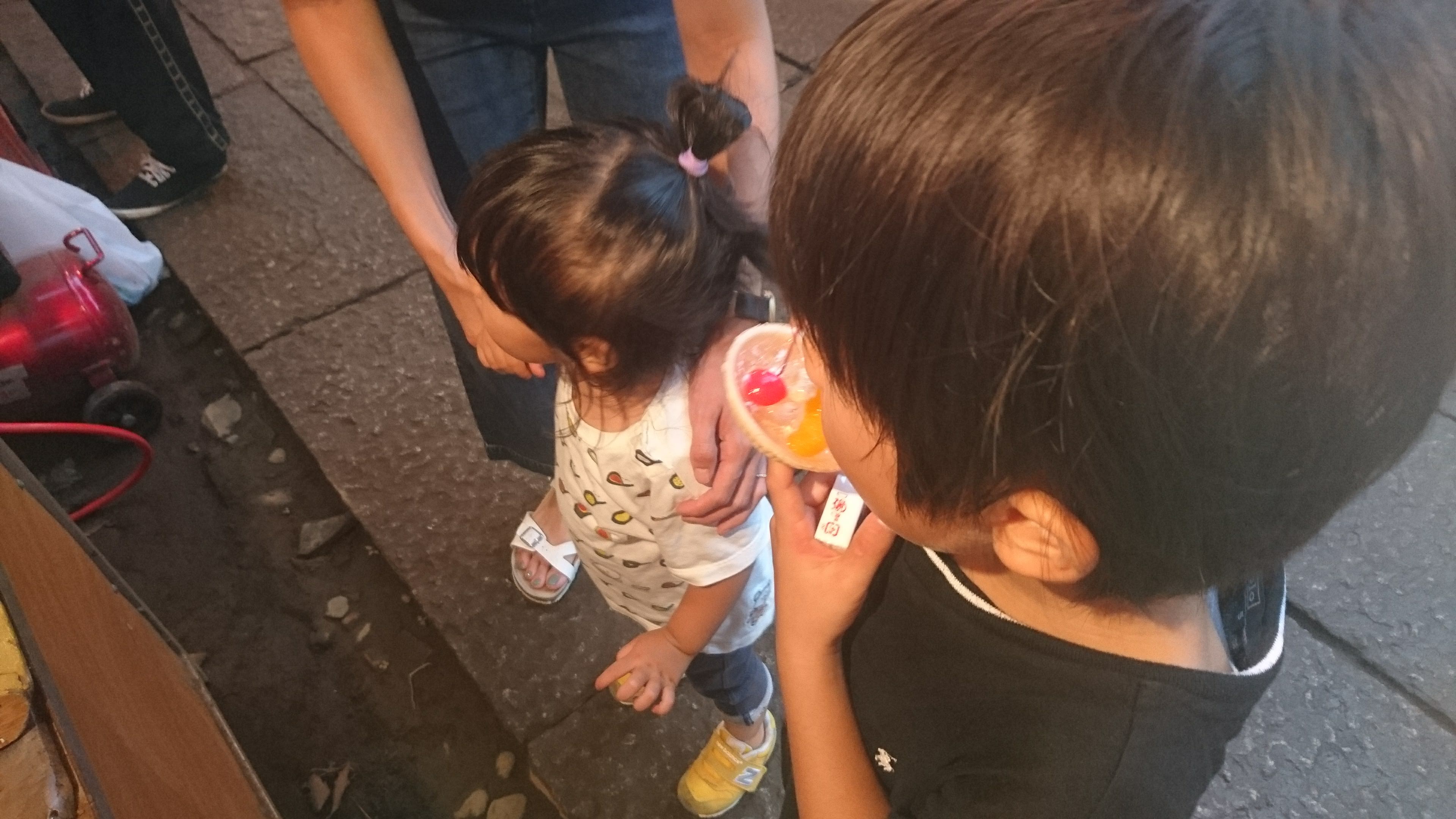 近所のお祭りにて水あめを初めて?食べました。歯にくっつく感じやベタベタしたのがイヤだったのか私が二つ食べることに(笑)
